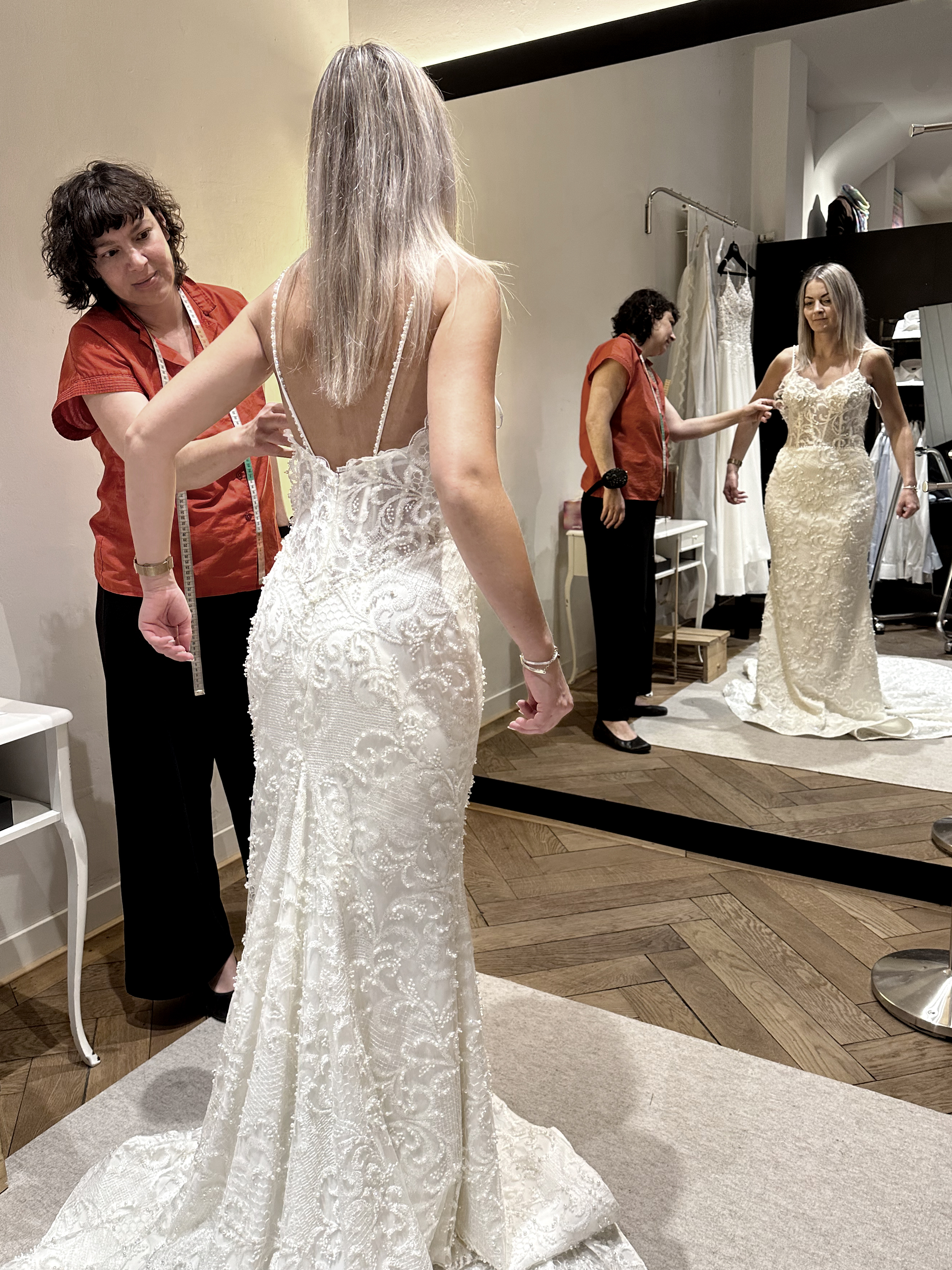 Gerade bei Kleidern mit Spitze, Stickerei oder Perlen ist bei grösseren Änderungen häufig ein zweiter oder dritter Termin notwendig.